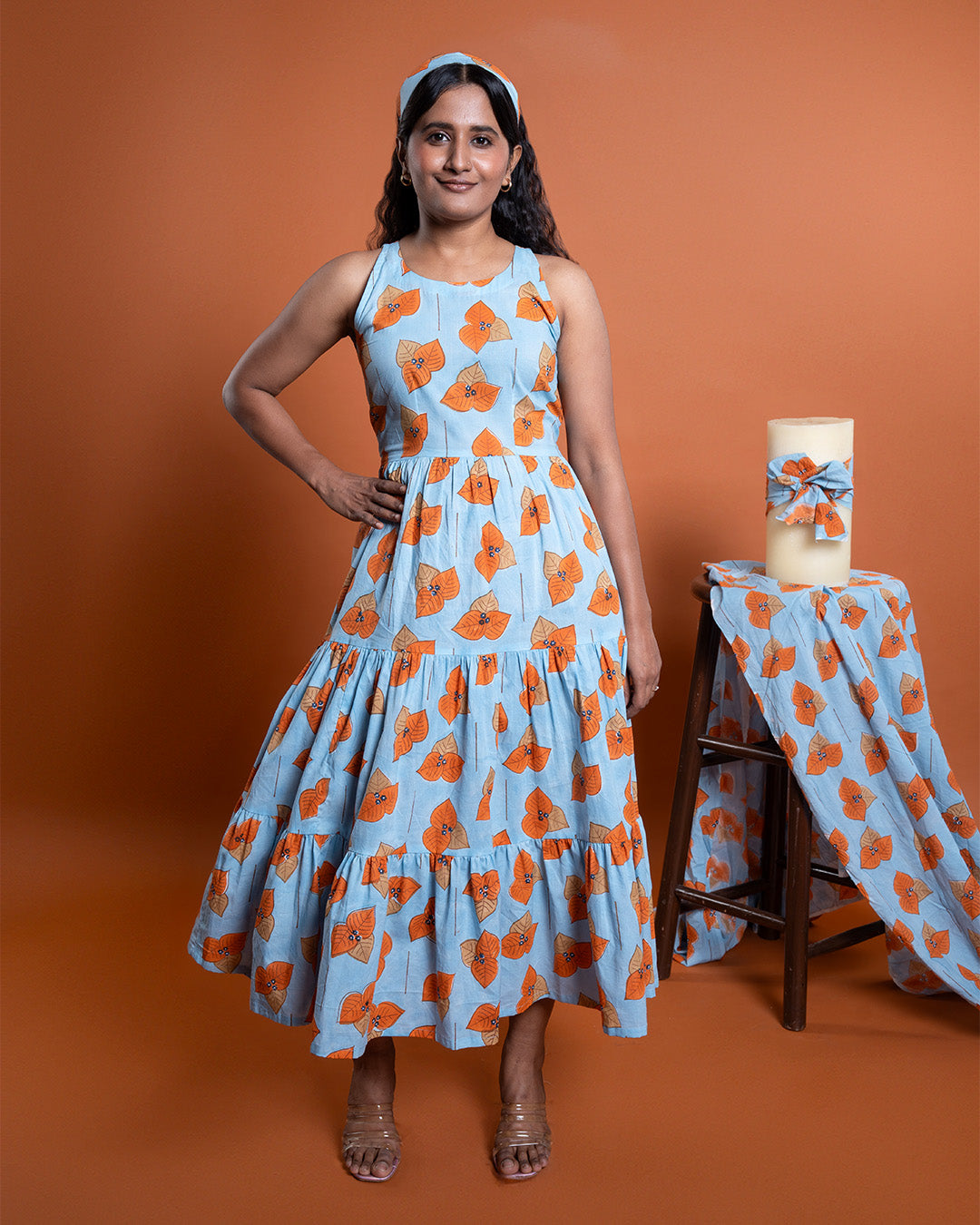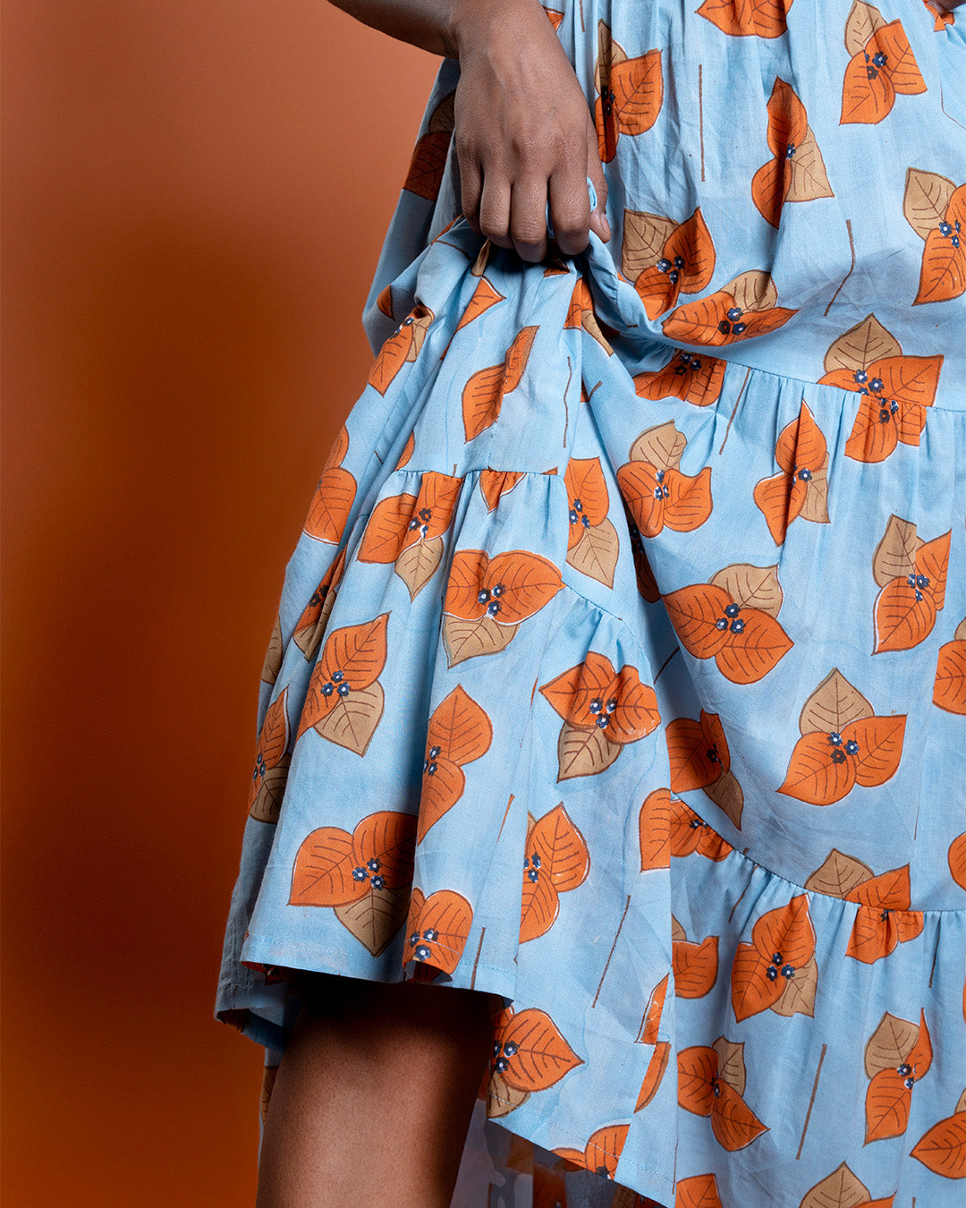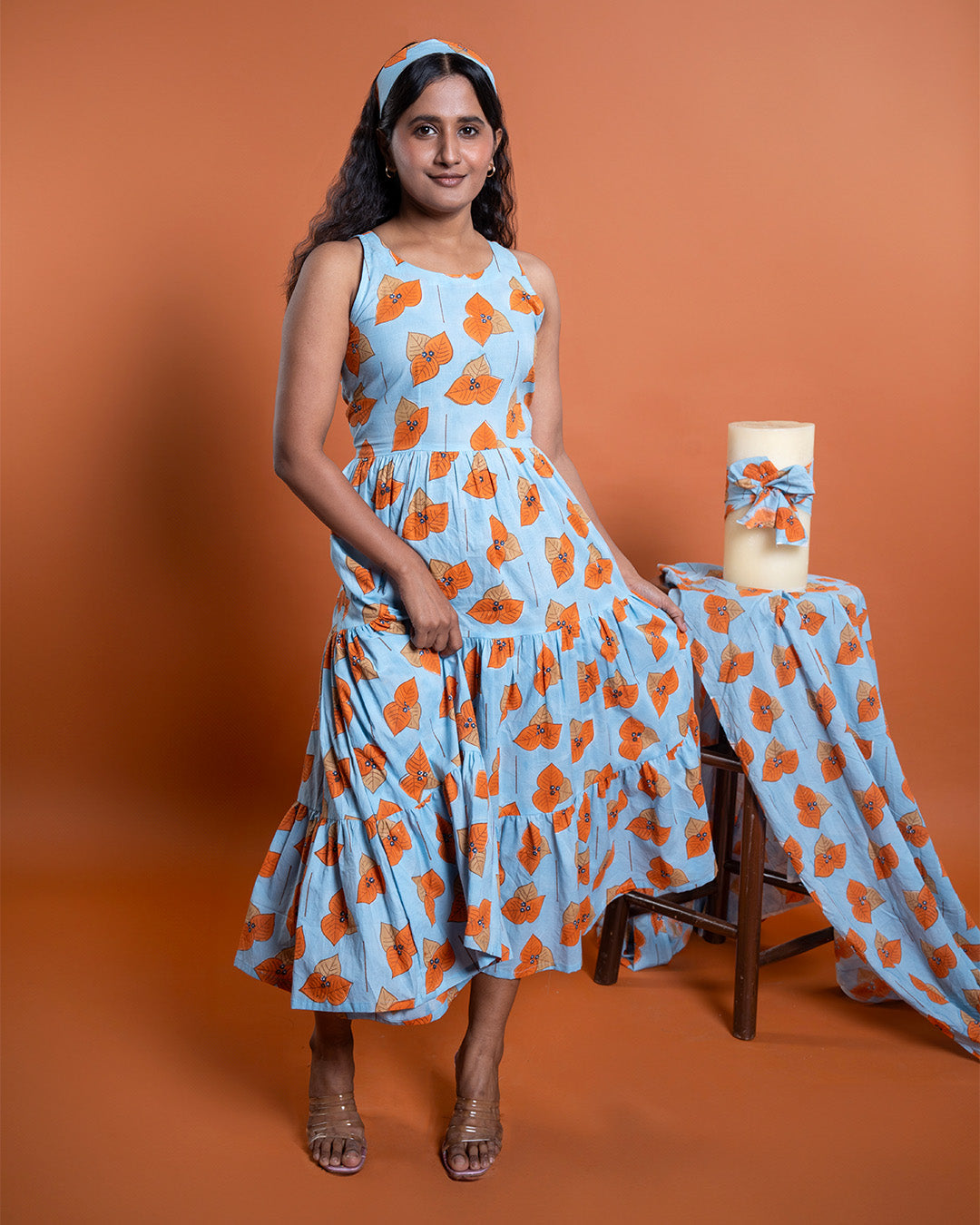 Step into effortless elegance with the Azure Bloom Dress. This enchanting three-step dress, crafted from pure cotton and featuring hand-blocked prints, is a masterpiece of comfort and style. The deep blue hue sets the stage for a cascade of vibrant orange flowers, creating a visually striking contrast that embodies the spirit of summer.