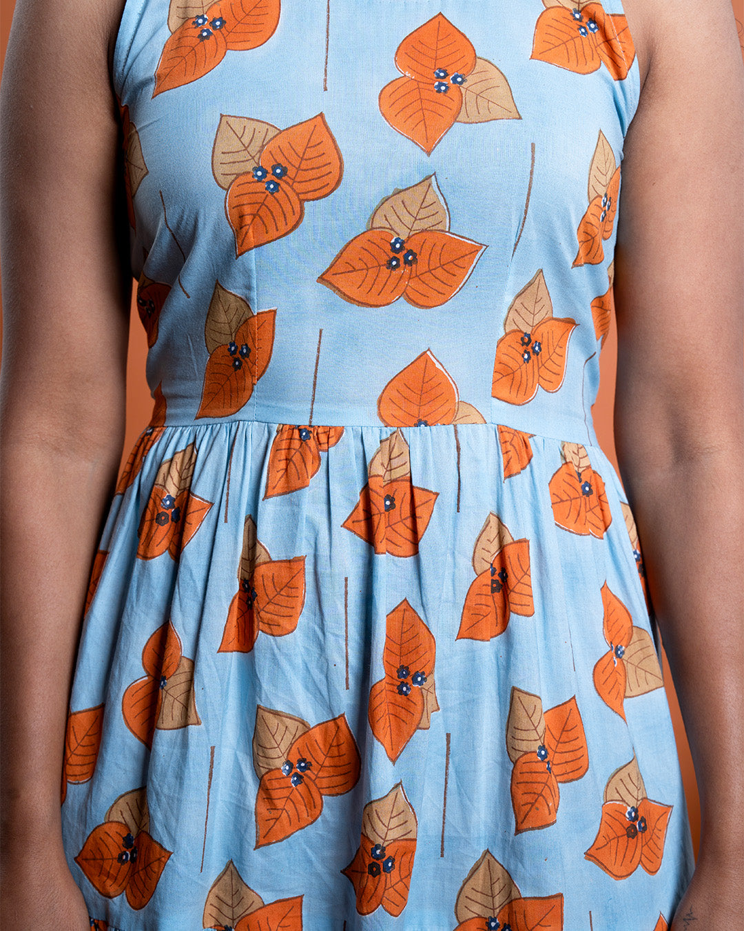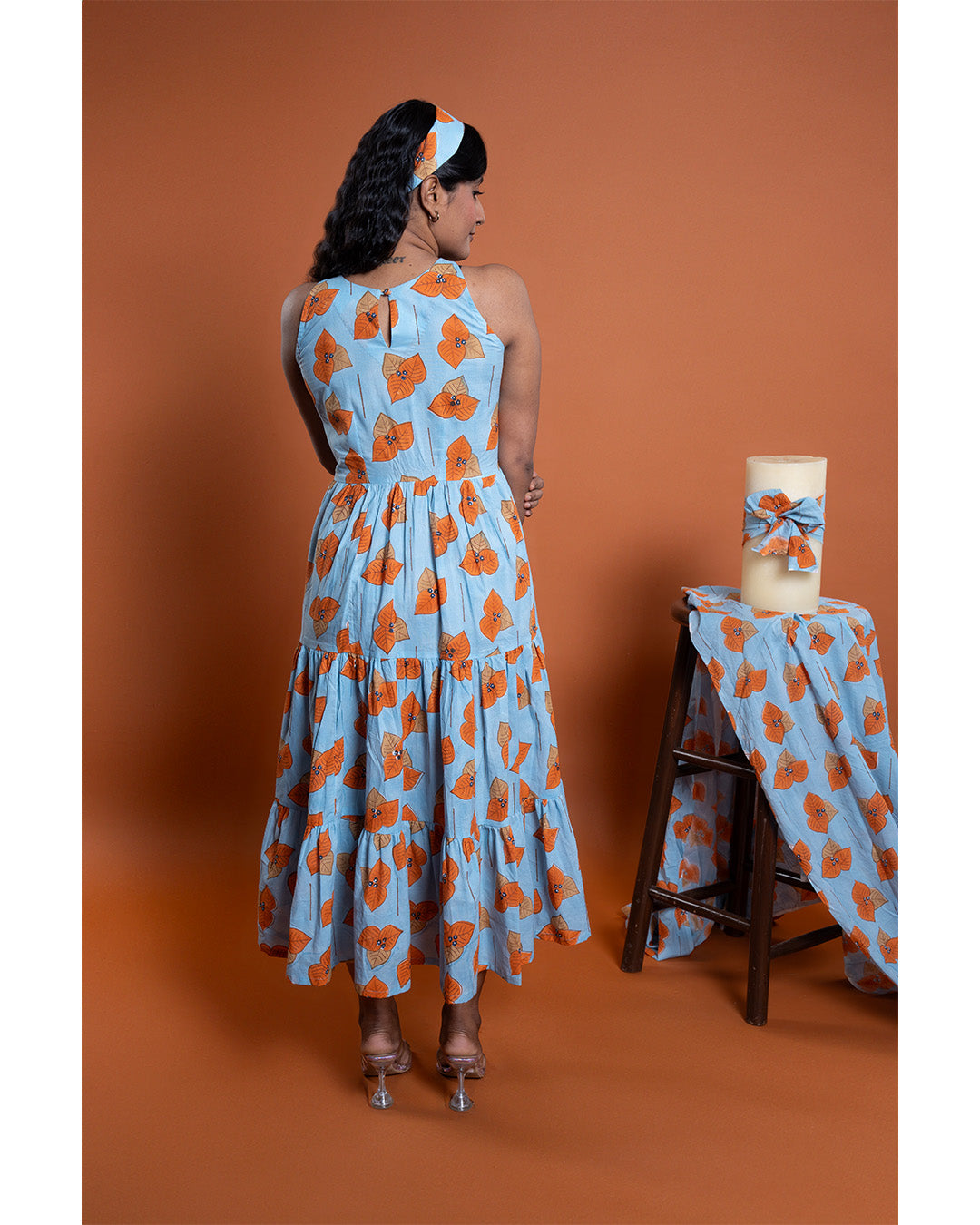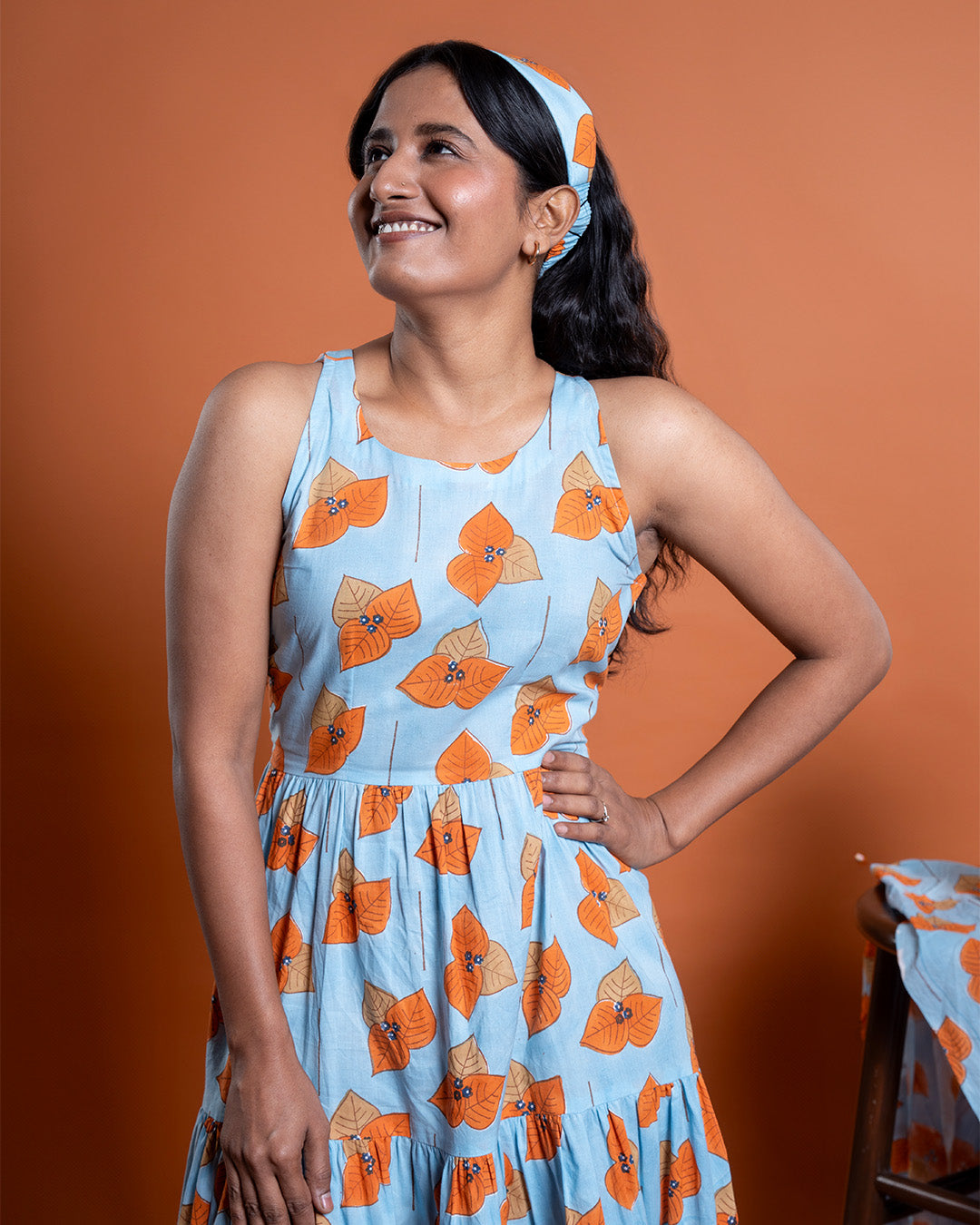 Step into effortless elegance with the Azure Bloom Dress. This enchanting three-step dress, crafted from pure cotton and featuring hand-blocked prints, is a masterpiece of comfort and style. The deep blue hue sets the stage for a cascade of vibrant orange flowers, creating a visually striking contrast that embodies the spirit of summer.