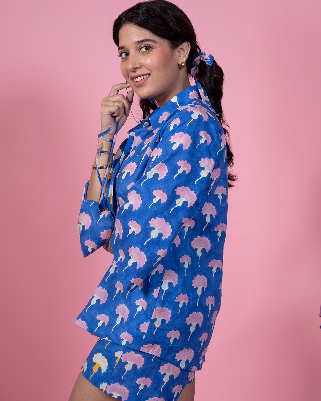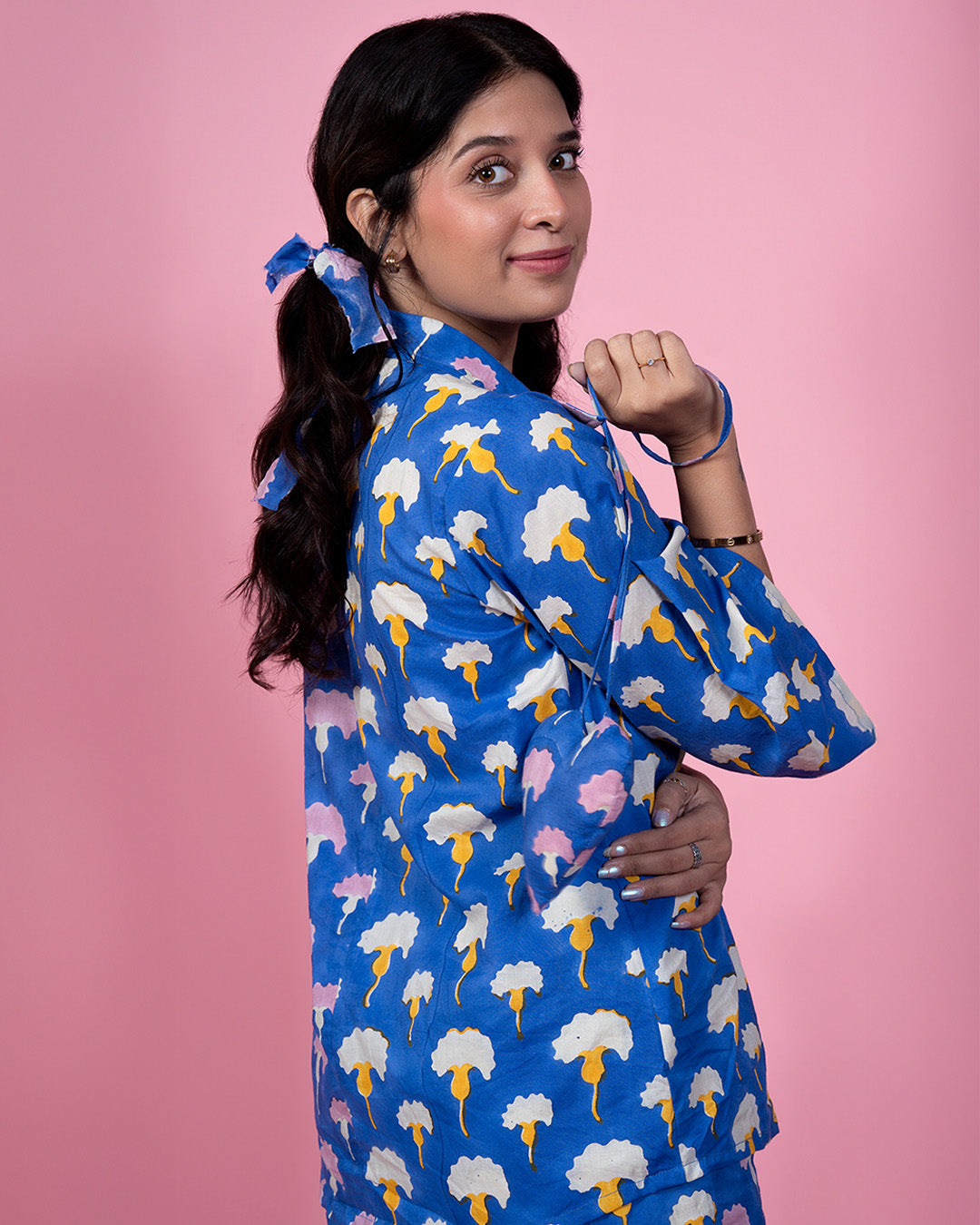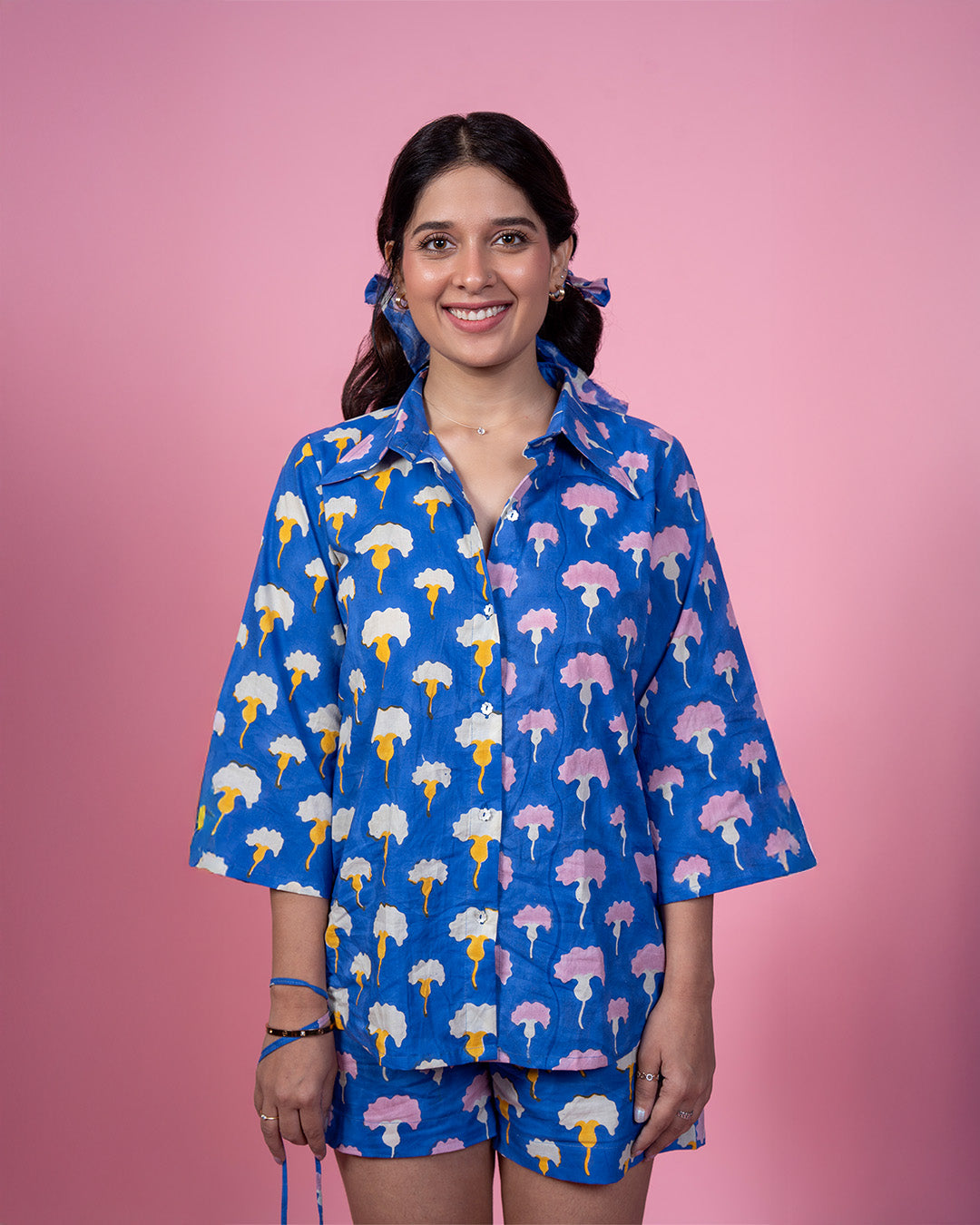Add a touch of vibrant elegance to your wardrobe with our Floral Fusion Shirt. This unique blue shirt features a beautiful contrast—on one side, delicate yellow and white flowers bloom, while on the other, soft pink and white flowers create a striking balance. Made from 100% cotton and hand-blocked by skilled artisans, this shirt combines comfort with traditional craftsmanship. Perfect for making a statement, the Floral Fusion Shirt brings together art and fashion in every stitch.