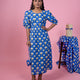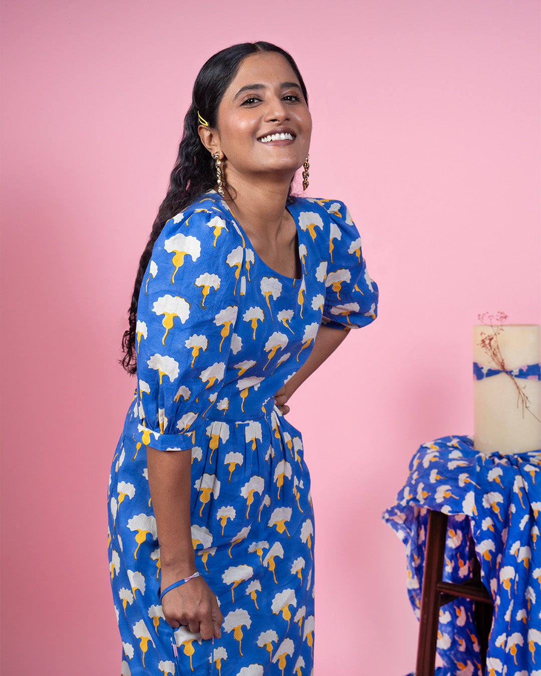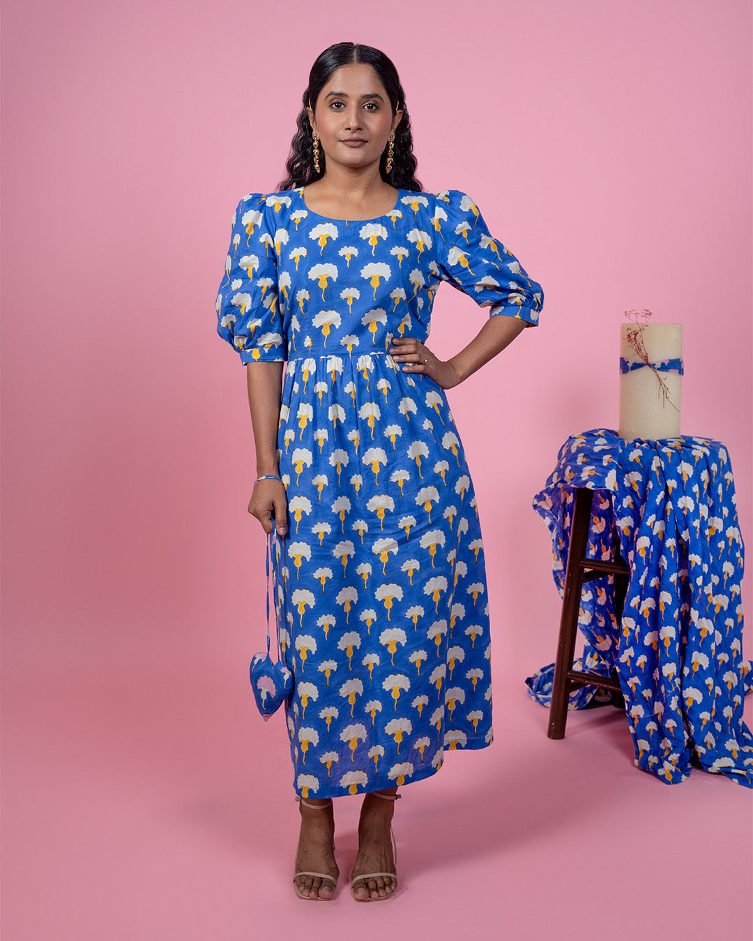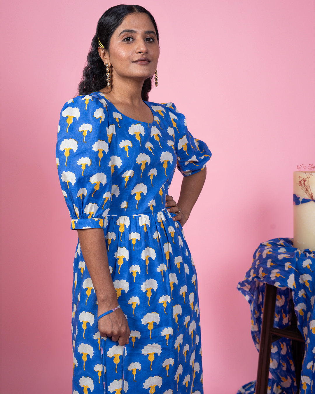 Unveil a touch of elegance with the Bluebell Bloom Dress, a charming one-piece crafted from 100% pure cotton and adorned with hand-blocked floral designs. The dress features a serene blue hue with delicate yellow and white flowers that evoke the beauty of a blooming garden.