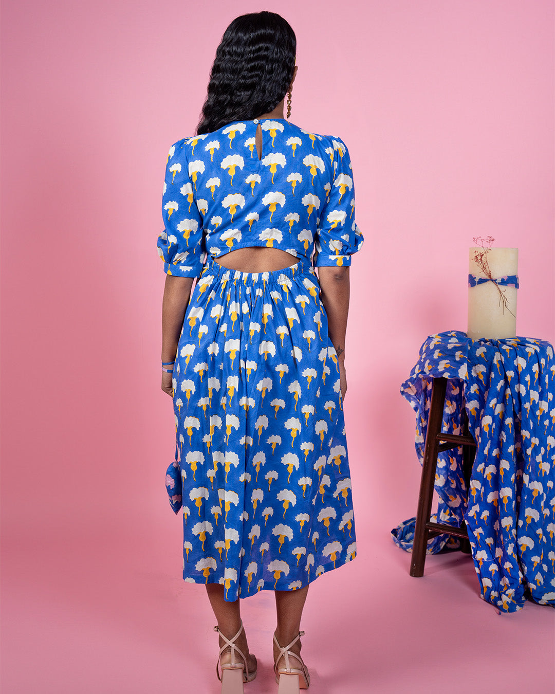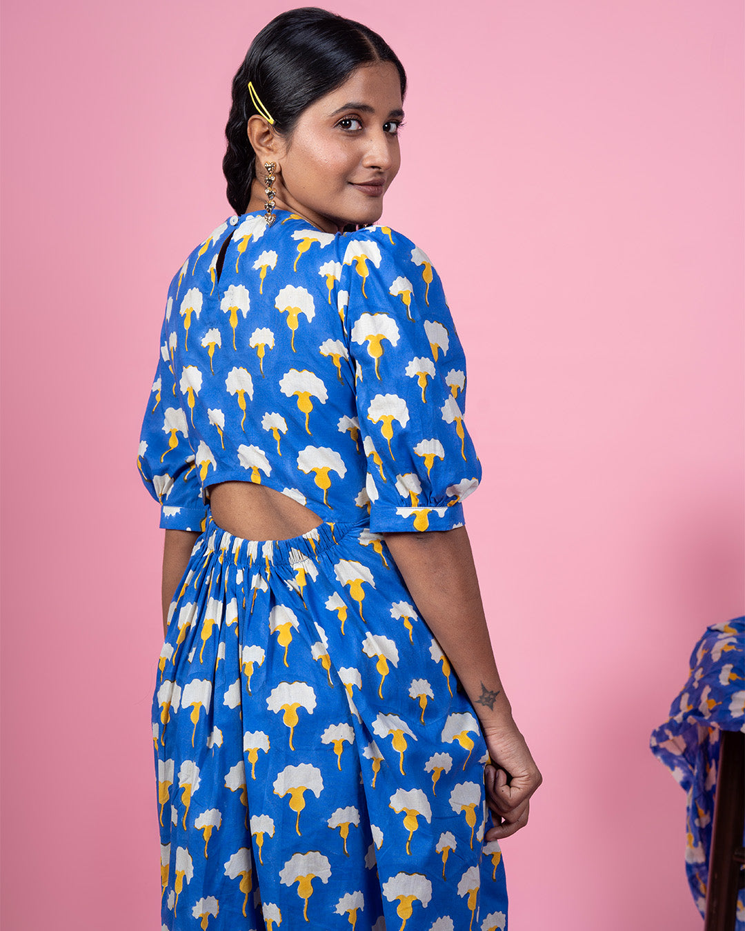 The Bluebell Bloom Dress is designed with a graceful half-moon cut at the back, adding a hint of sophistication, while the pretty puff sleeves enhance its feminine allure. This dress seamlessly blends artisanal craftsmanship with contemporary style, ensuring you look and feel exquisite whether you're attending a casual event or a special occasion.