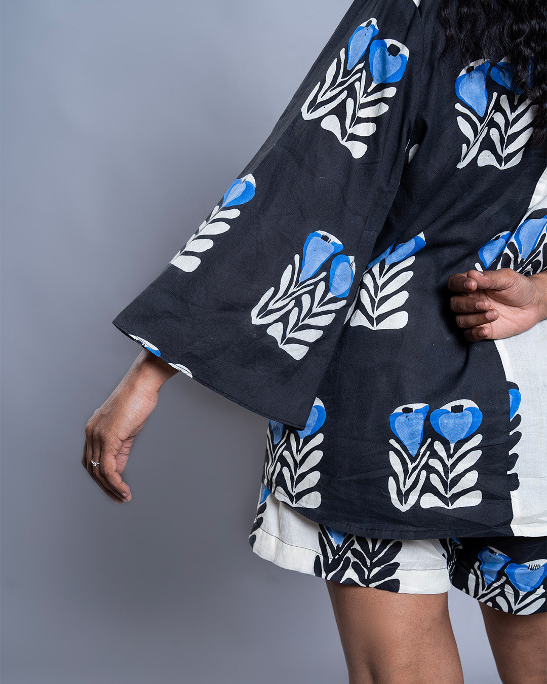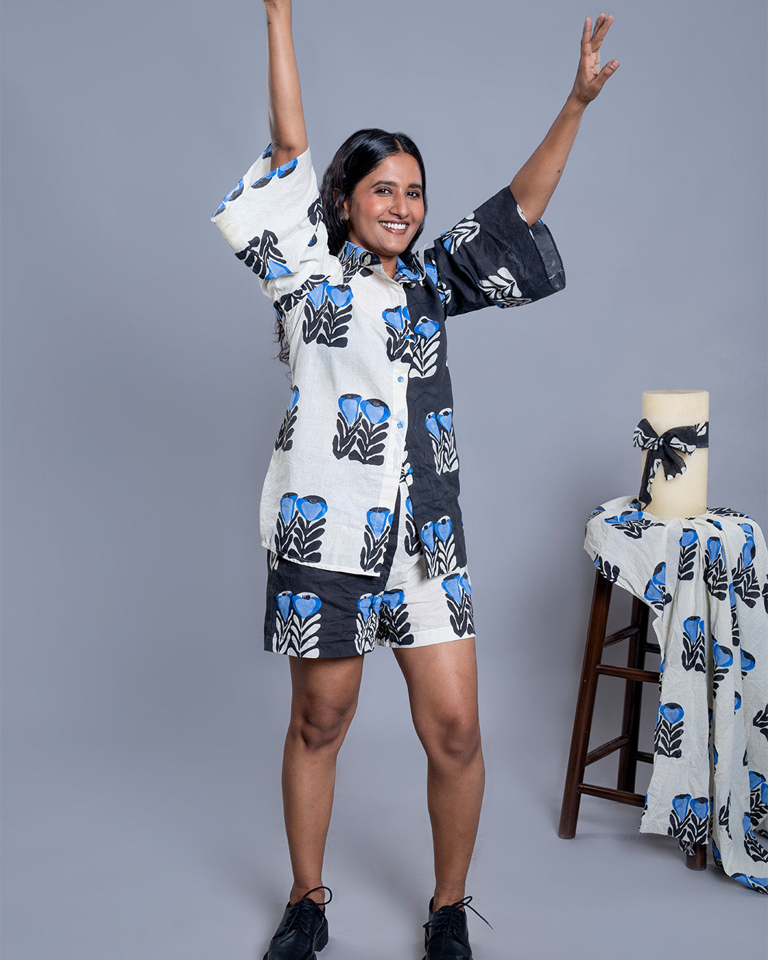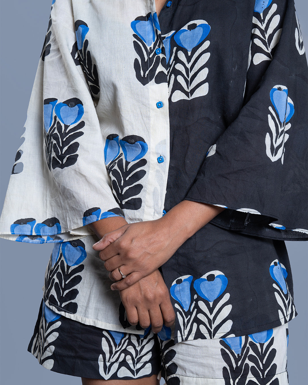Elevate your wardrobe with the Dual Shade Blossom Shirt, a striking piece that merges classic elegance with contemporary flair. Crafted from 100% cotton, this shirt features a unique hand-blocked design that contrasts two sophisticated shades. One side showcases a sleek black background adorned with vibrant blue and white flowers, while the other side boasts a crisp white background highlighted by blue and black blooms.