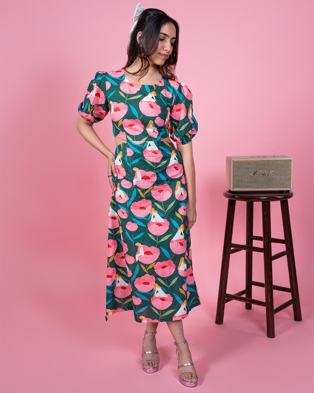 The Floral Allure Dress features a graceful flair that adds a touch of romance to its silhouette. Its puff sleeves and basic round neckline offer timeless charm, while the unique half-moon cut on both sides of the waist creates a flattering, sculpted effect. The practical zip at the back ensures a seamless fit and ease of wear.