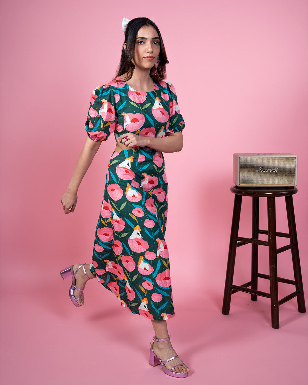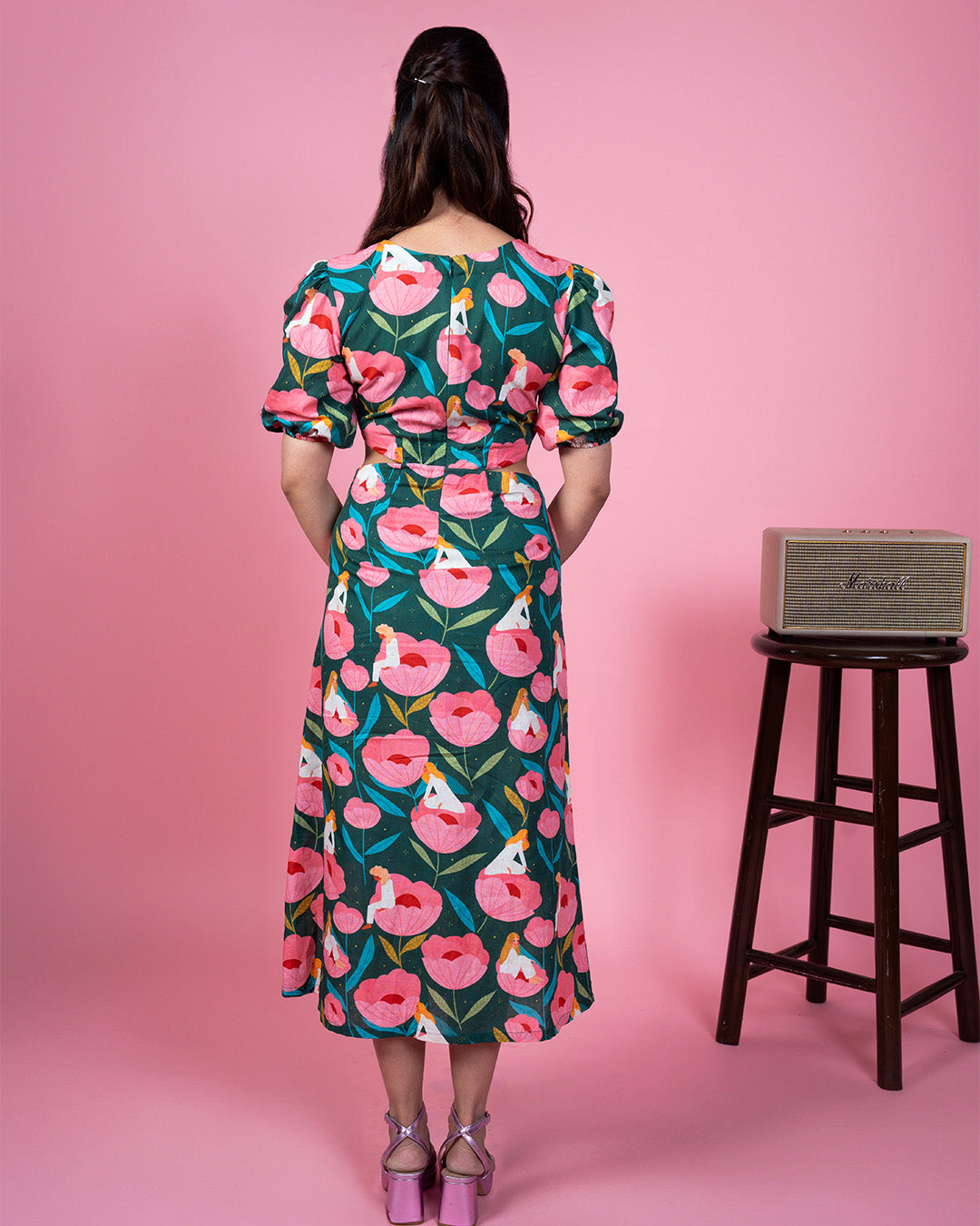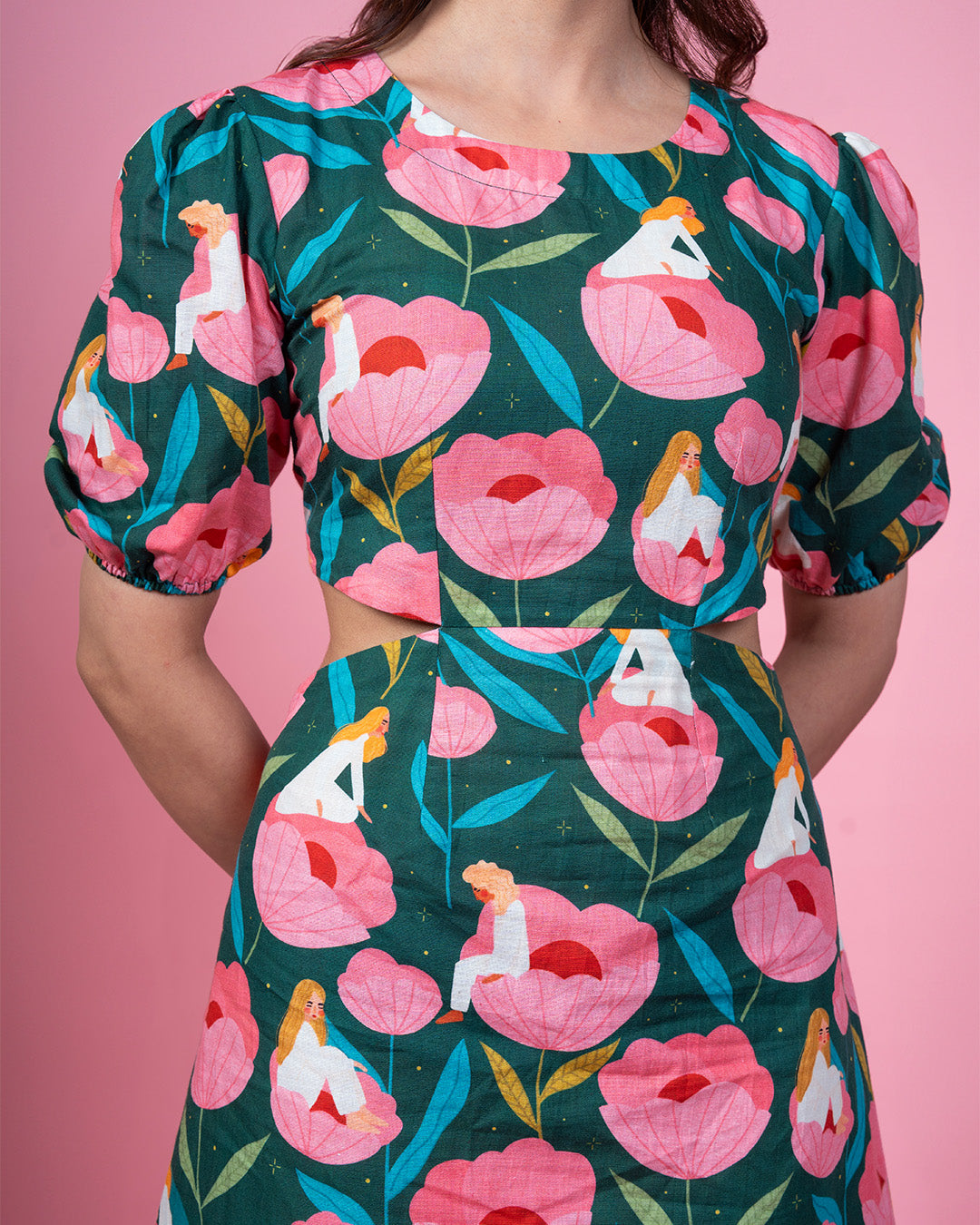The Floral Allure Dress – a captivating blend of natural beauty and elegant design. This one-piece dress, crafted from luxurious linen fabric, boasts a deep dark green base beautifully adorned with vibrant pink flowers and a mix of rich dark and light green leaves, brought to life through a refined digital print.
