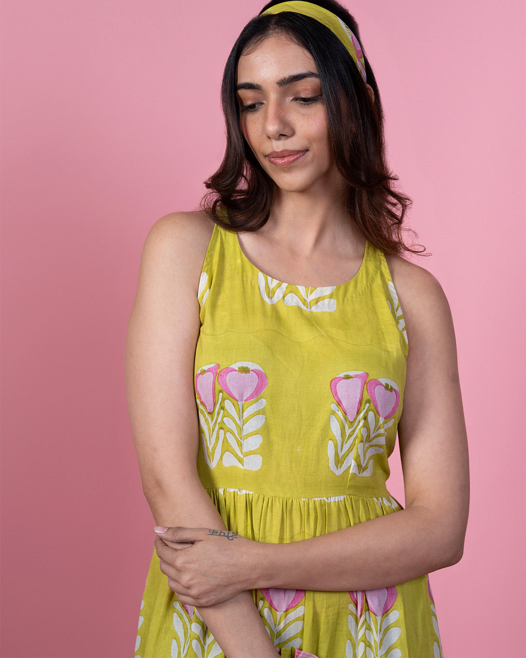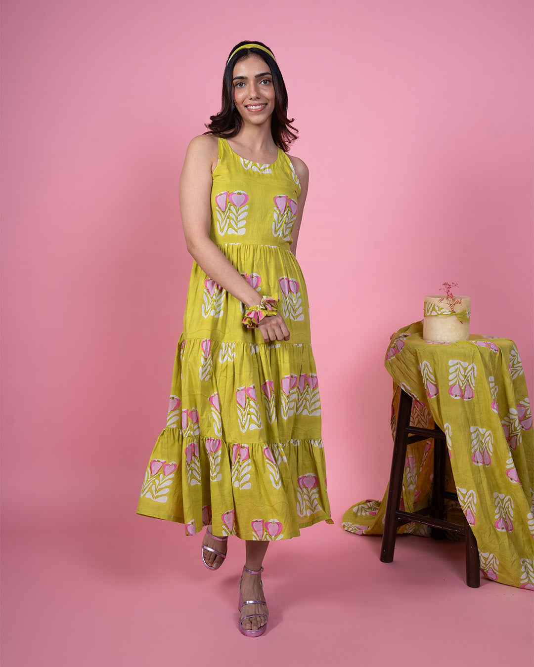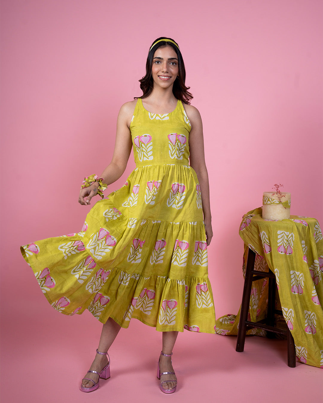 The soft, breathable cotton ensures comfort throughout the day, while the hand-blocked floral pattern adds a unique, artisanal touch. With its three-tiered design, the dress offers a flattering silhouette that moves beautifully with you. Ideal for any occasion, whether you're enjoying a sunny day out or a casual gathering, the Yellow Bloom One-Piece Dress is sure to make you stand out with effortless grace.Crafted with care and 3 meters of fabric, this dress ensures both quality and comfort.