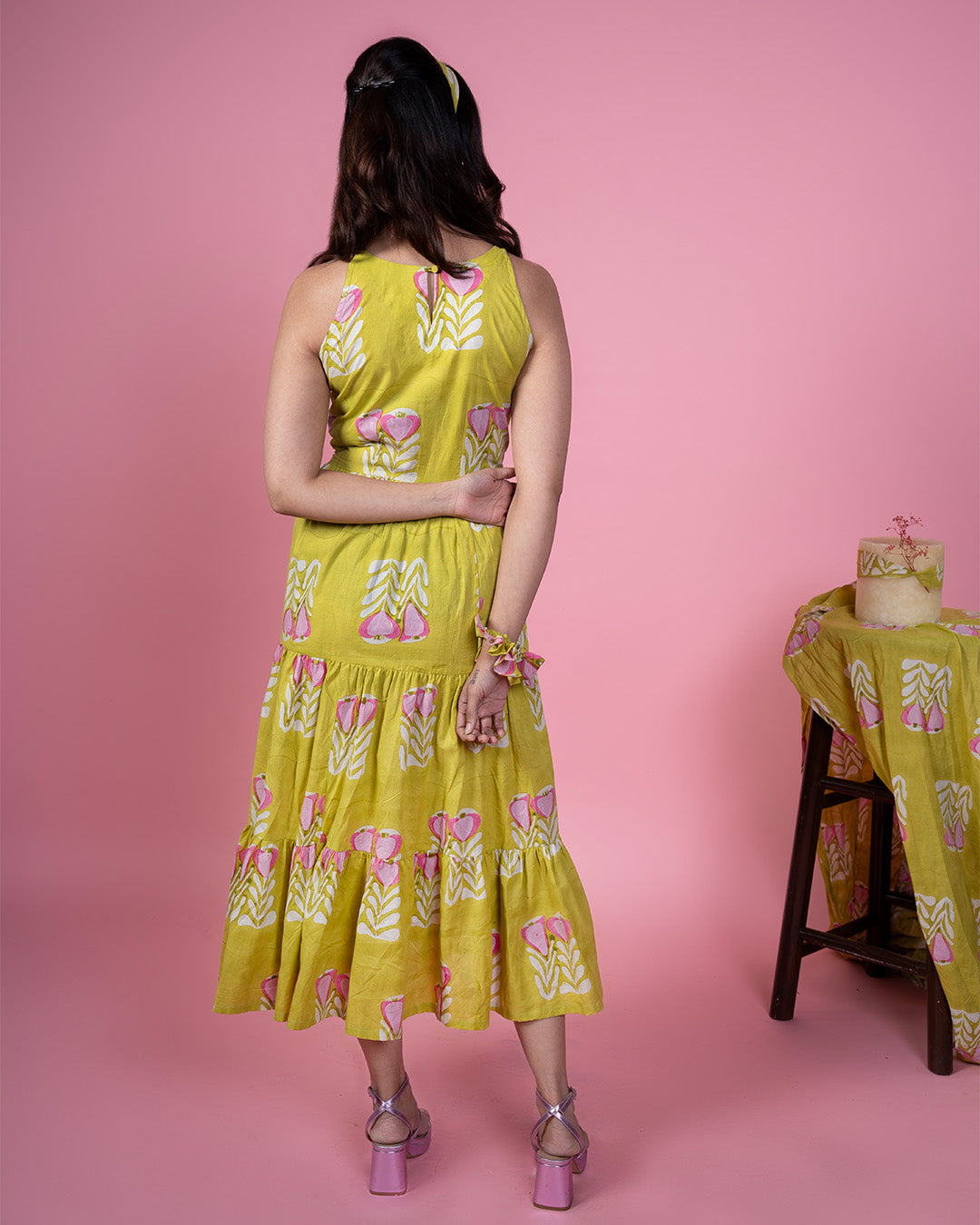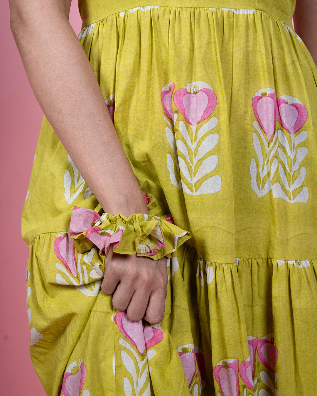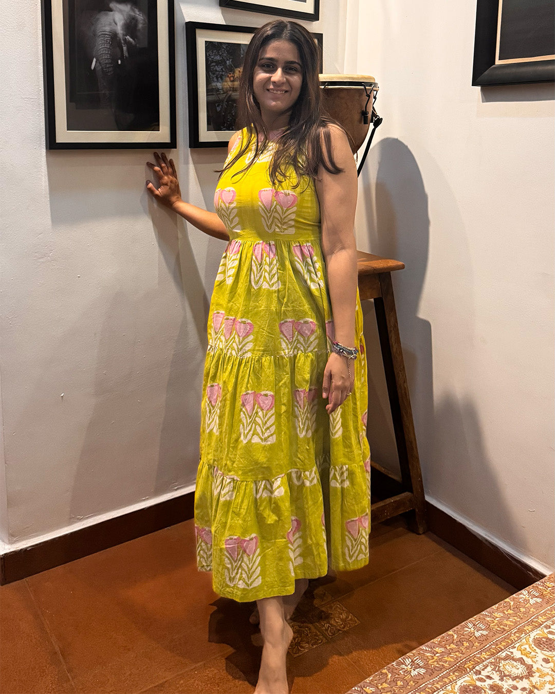 The soft, breathable cotton ensures comfort throughout the day, while the hand-blocked floral pattern adds a unique, artisanal touch. With its three-tiered design, the dress offers a flattering silhouette that moves beautifully with you. Ideal for any occasion, whether you're enjoying a sunny day out or a casual gathering, the Yellow Bloom One-Piece Dress is sure to make you stand out with effortless grace.Crafted with care and 3 meters of fabric, this dress ensures both quality and comfort.