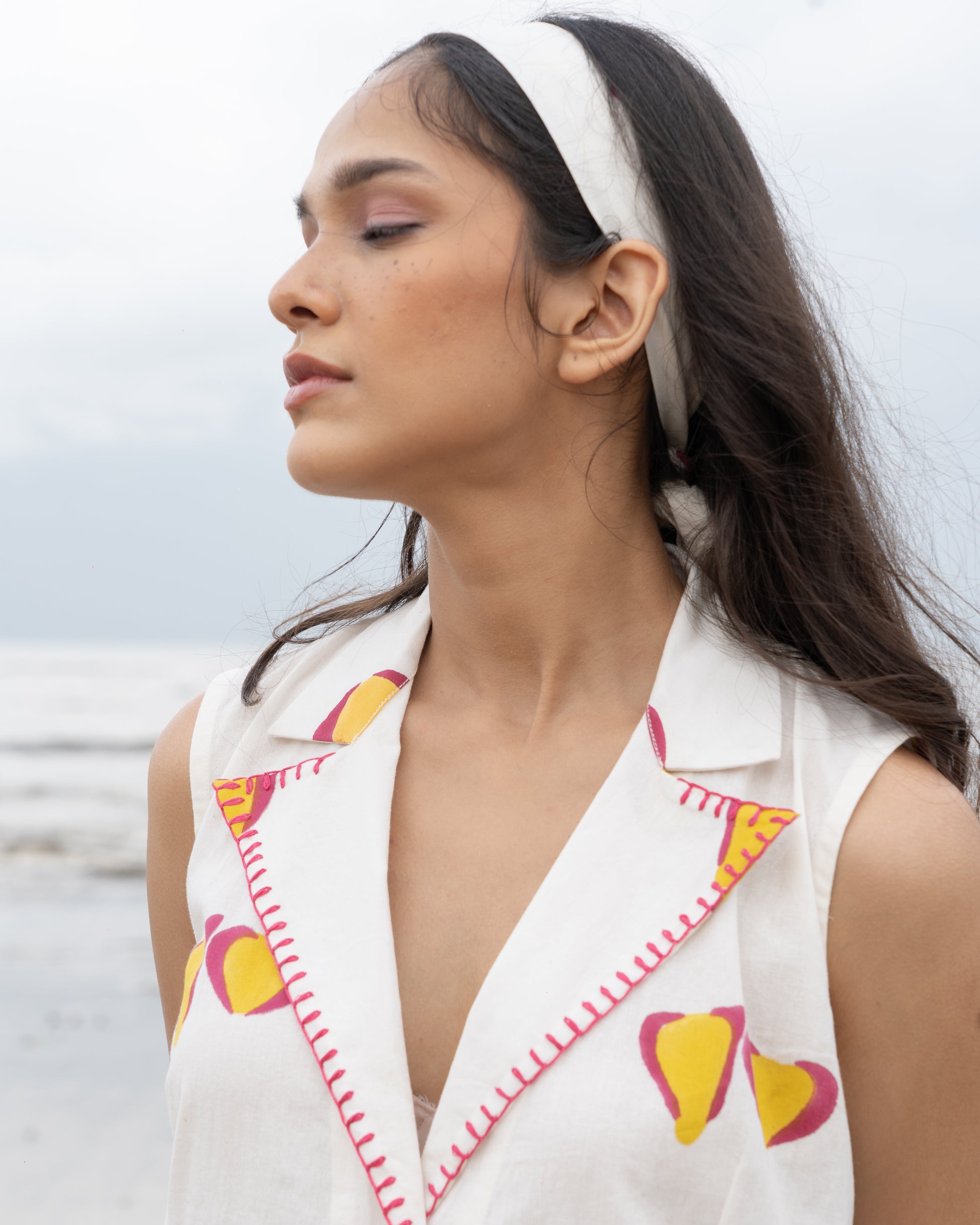 Features delicate knotted strap sleeves and subtle hand embroidery, blending strength with softness