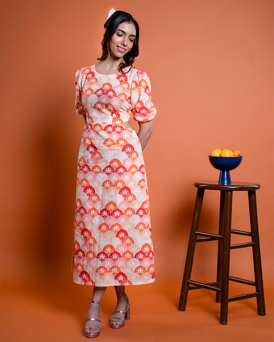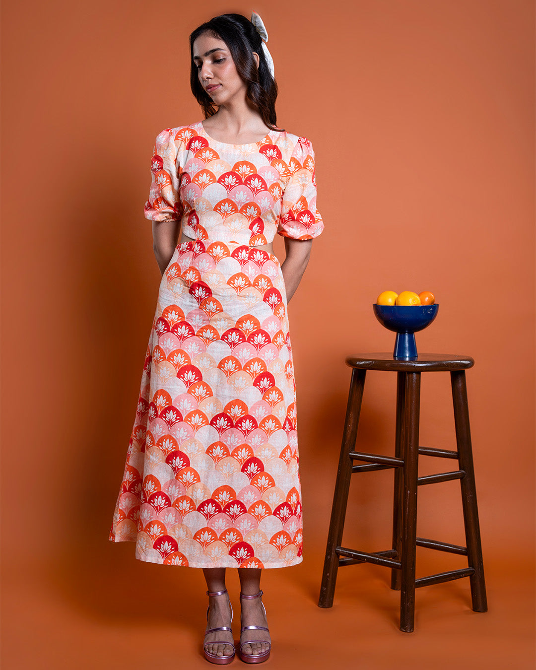 Crafted from high-quality linen, the Spectrum Blossom Dress combines comfort with elegance. Its unique moon cut on the waist creates a flattering silhouette, while the puff sleeves and round neckline add a touch of classic charm. A convenient zip at the back ensures a seamless fit and ease of wear.