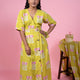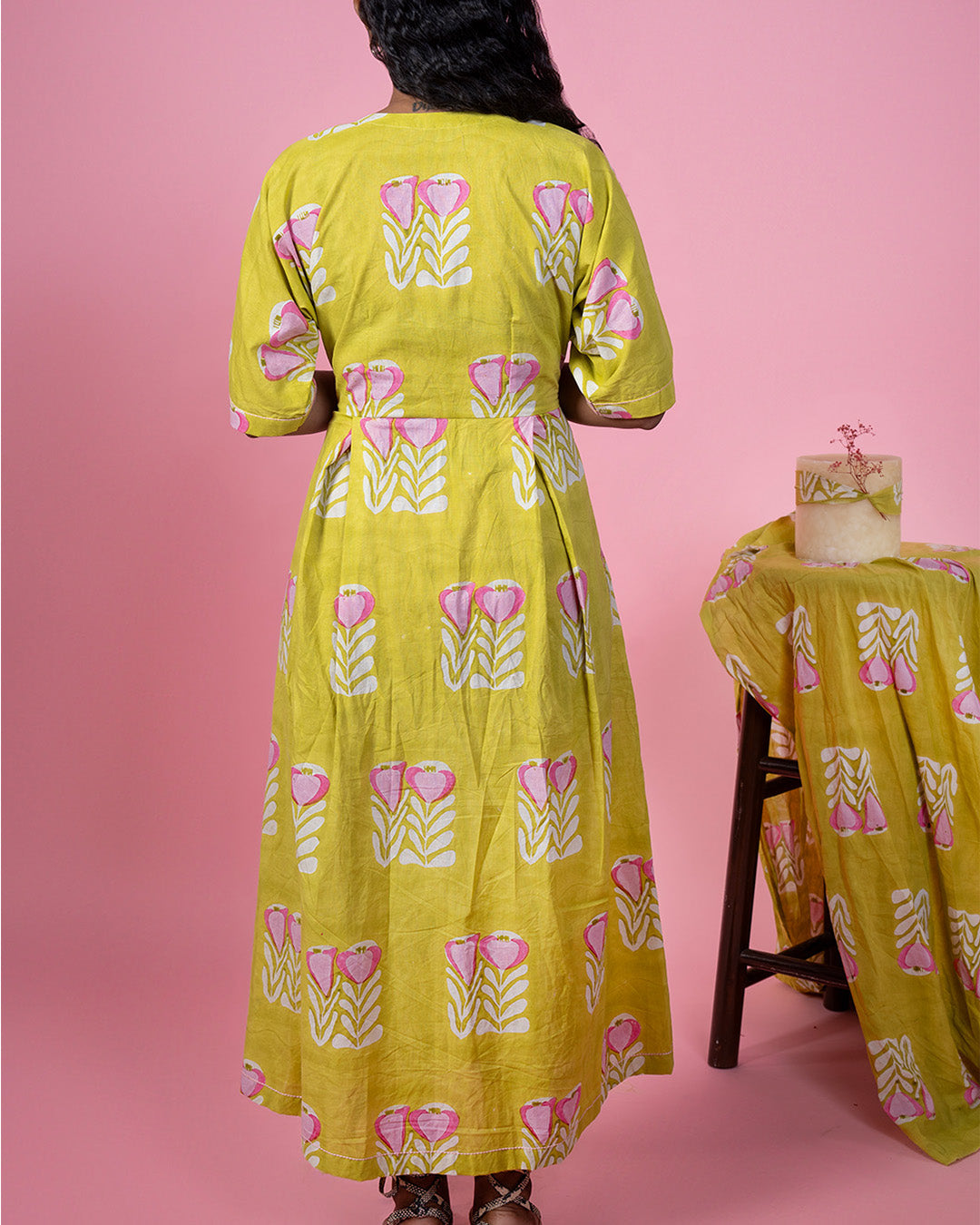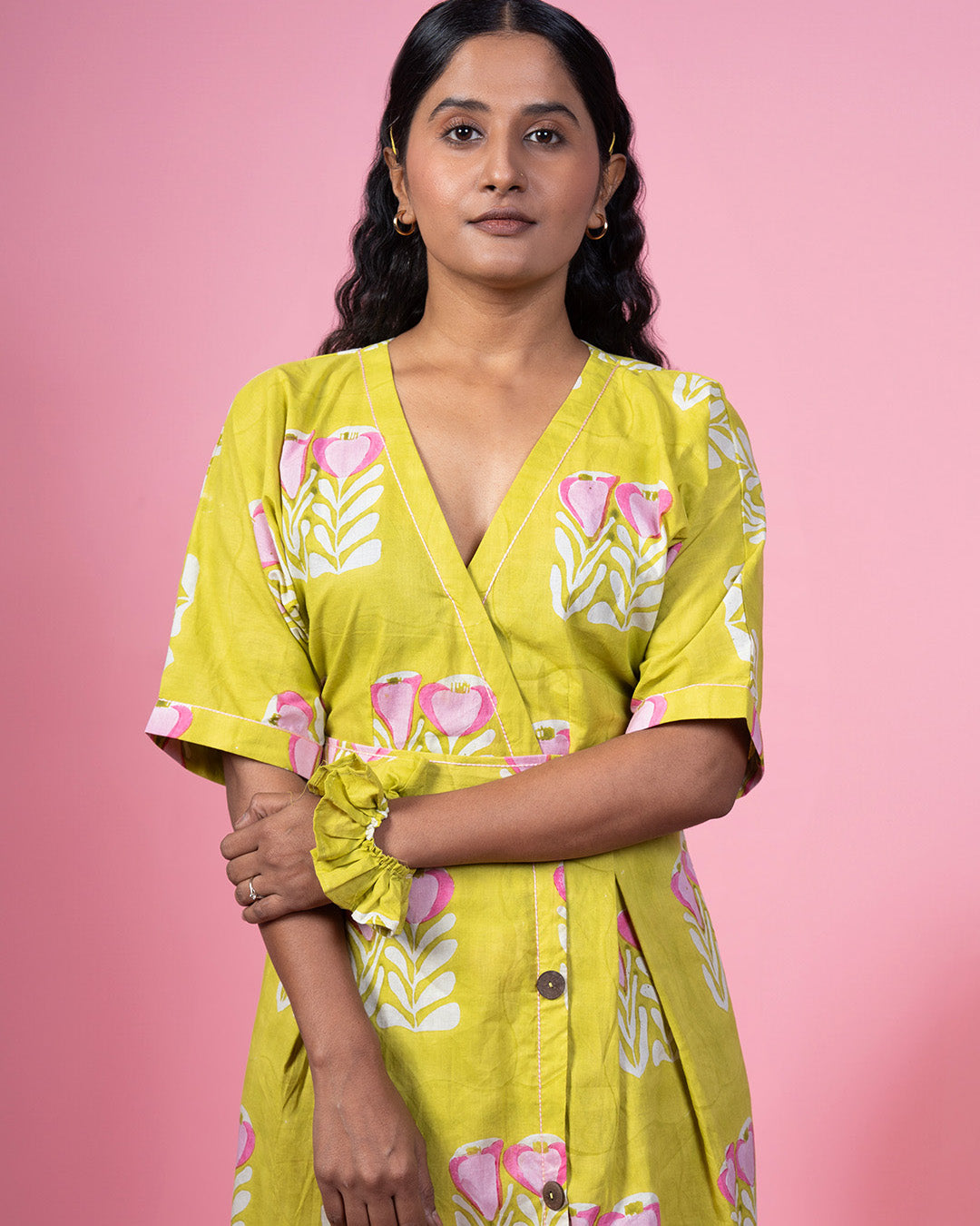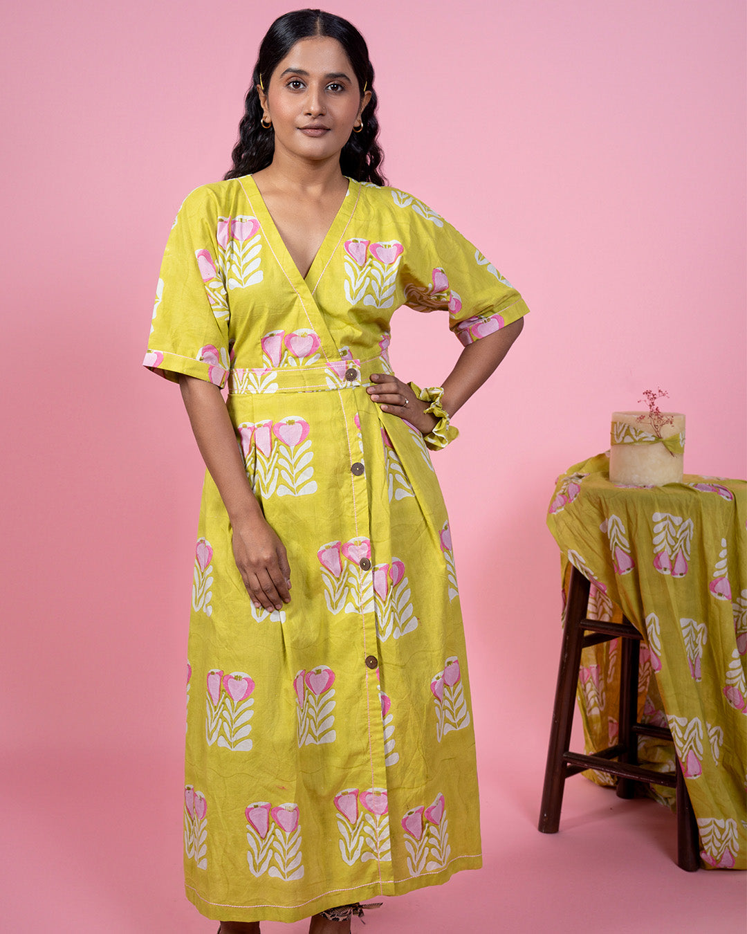 The Sunlit Floral Wrap Dress – a delightful blend of vibrant color and timeless elegance. This eye-catching wrap dress in sunny yellow is adorned with a charming hand-block print of pink and white flowers, meticulously crafted from 100% cotton for ultimate comfort and breathability.