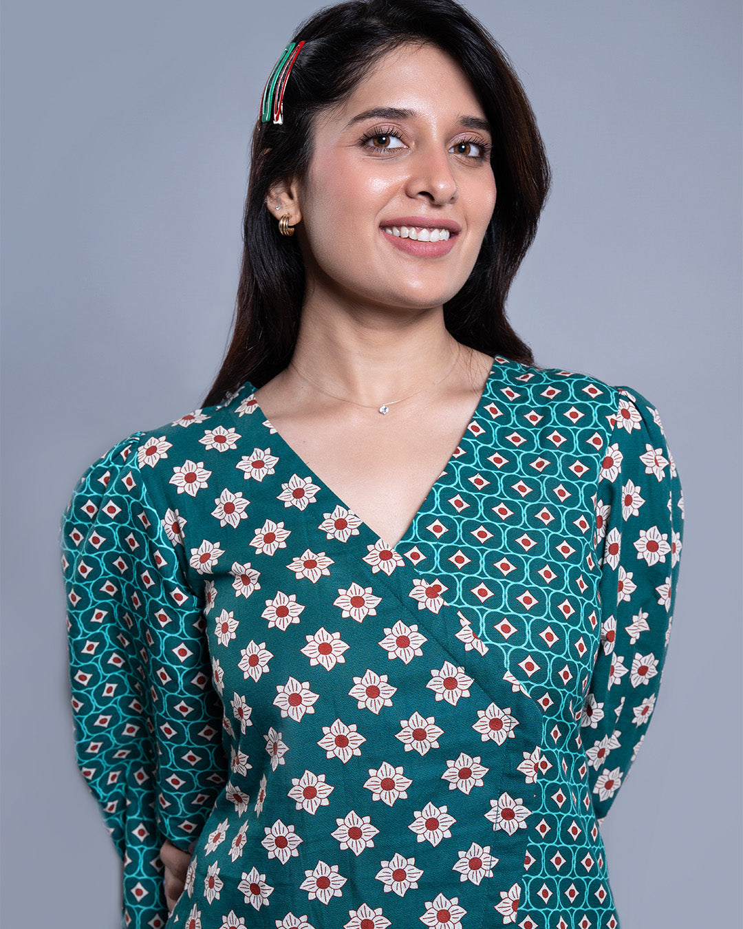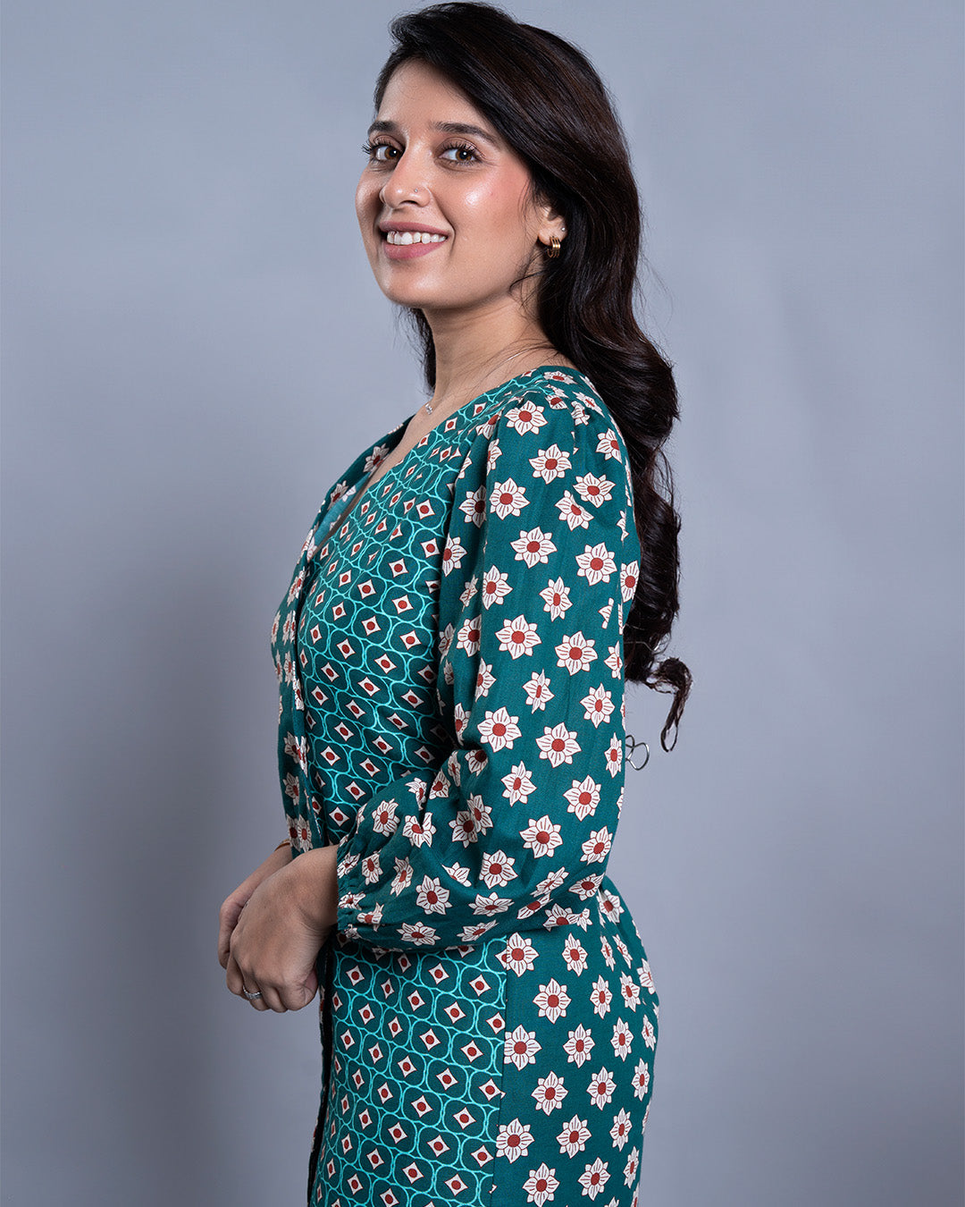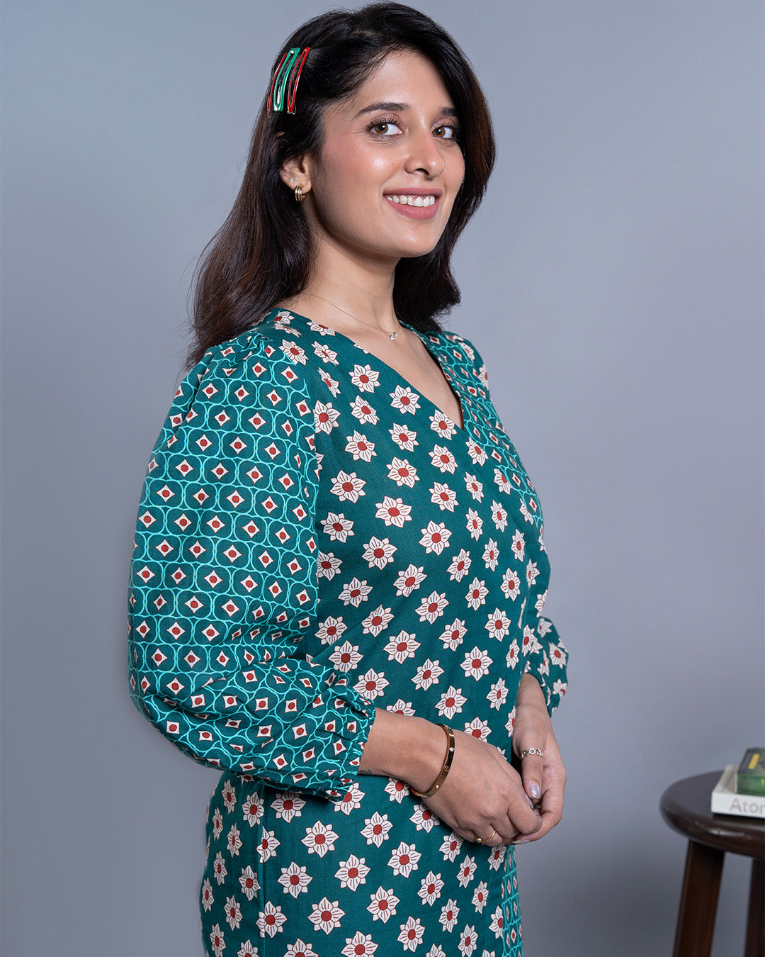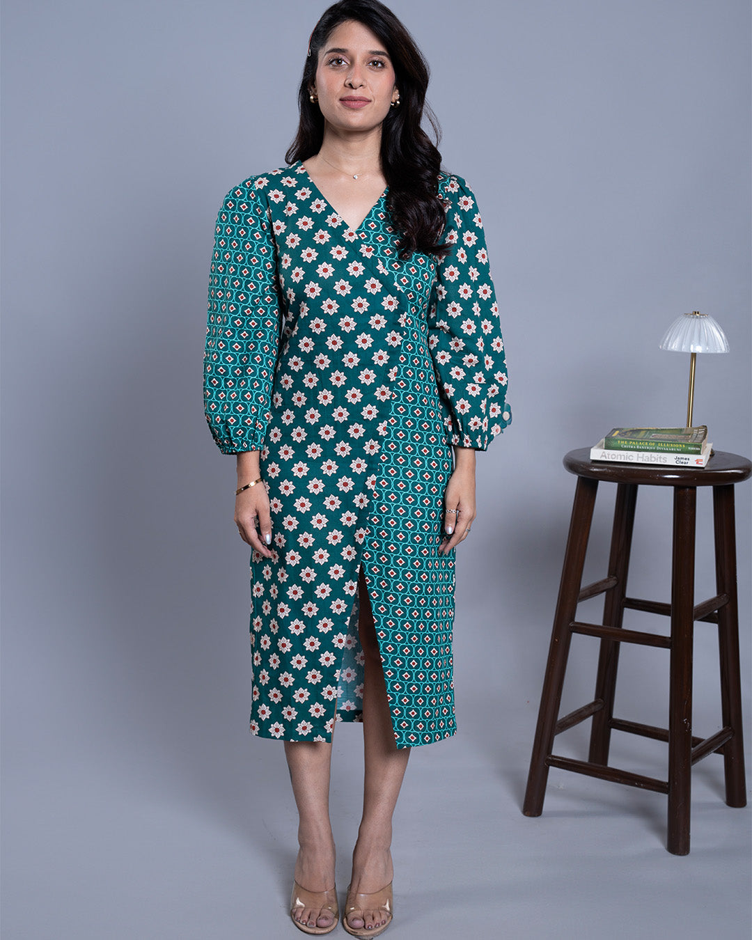 Crafted from high-quality linen with a digital print, the Teal Blossom Slit Dress combines comfort with sophistication. The dress features a chic front slit that adds a touch of drama, while the puff sleeves and V-neckline enhance its modern appeal.