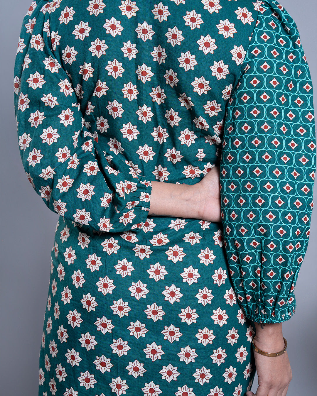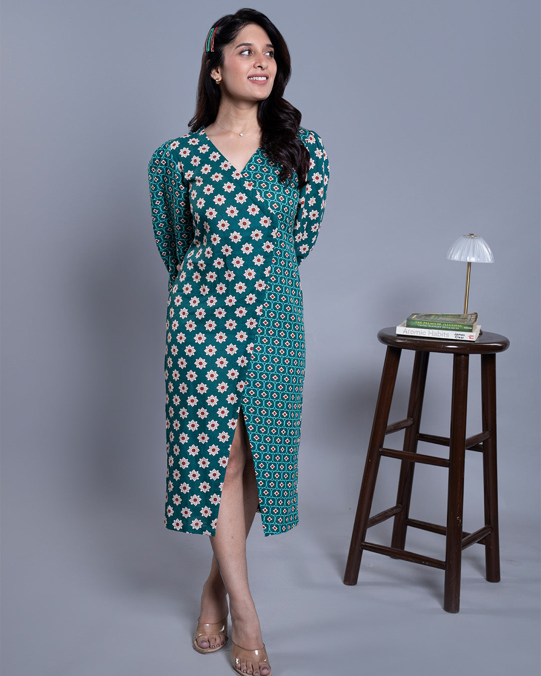 The Teal Blossom Slit Dress – a striking fusion of vibrant elegance and contemporary design. This one-piece dress in a captivating teal green showcases a unique floral contrast: lush, bold flowers grace one side, while the other side features a delicate array of smaller blooms.