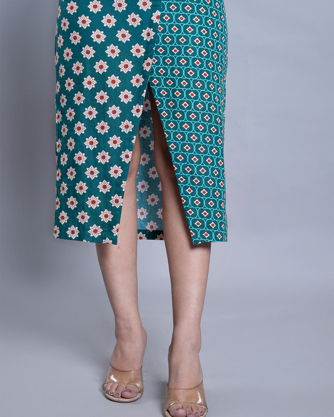 Designed with a perfect blend of two distinct fabrics, this dress creates a dynamic and stylish look. Ideal for any special occasion or an elegant day out, the Teal Blossom Slit Dress effortlessly balances eye-catching beauty with timeless grace. Embrace the floral elegance and make a bold statement with this unique and alluring dress.