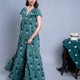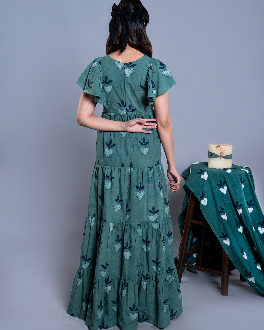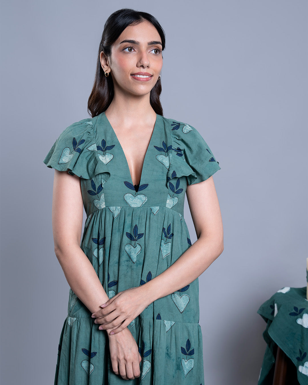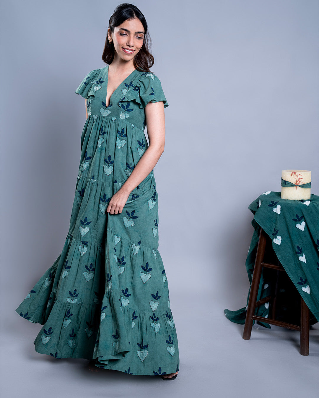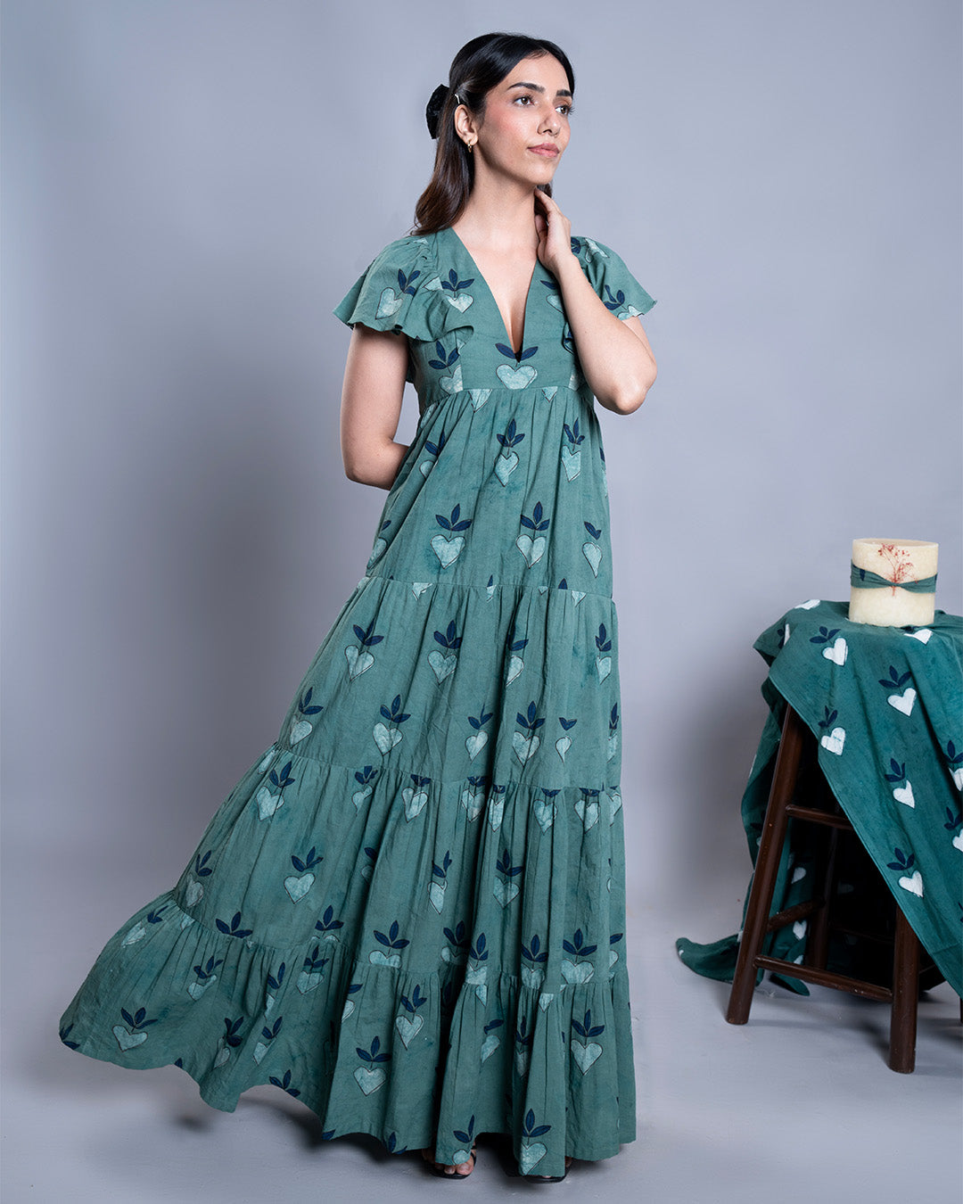 The Trellis flair Dress, a masterpiece of elegance and comfort. This full-length green dress features a four-step tiered design that creates a flowing, graceful silhouette, perfect for twirling through the day. Adorned with intricate hand-blocked floral patterns, this dress is a celebration of nature’s beauty, brought to life on soft, breathable cotton fabric. The V-neckline adds a touch of sophistication, while the frilled half sleeves bring a playful, feminine charm. Whether you're attending a casual day out or an evening gathering, the Trellis flair Dress ensures you stand out effortlessly. Embrace the perfect blend of style and comfort with this beautifully crafted piece that transitions seamlessly from day to night.5 meters of fabric used.